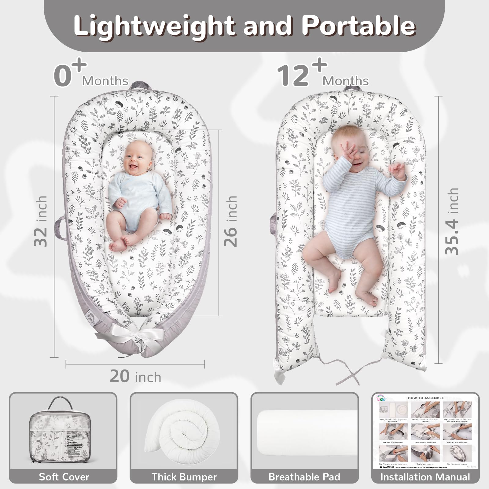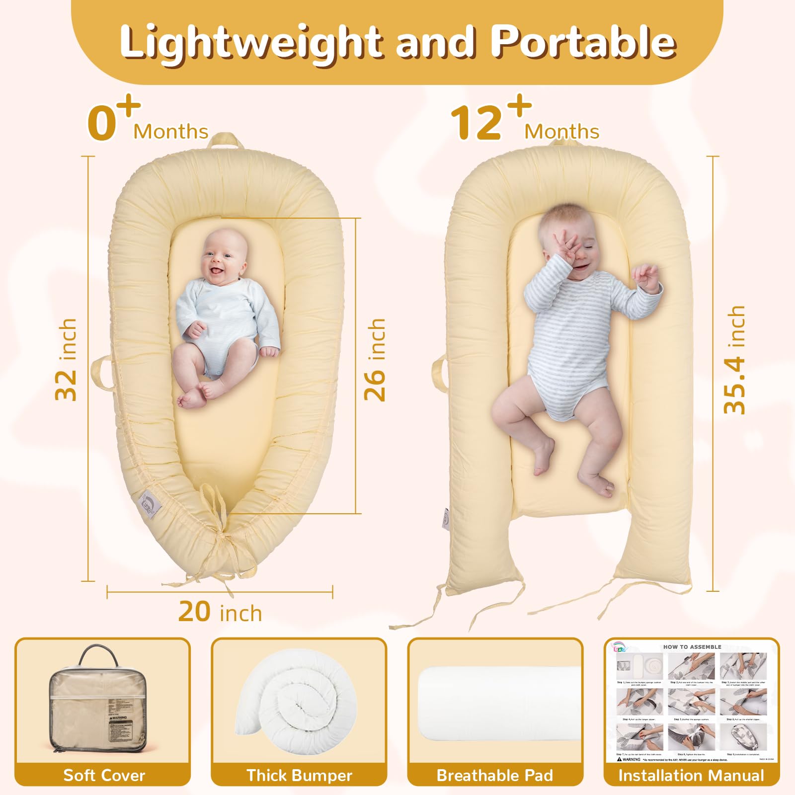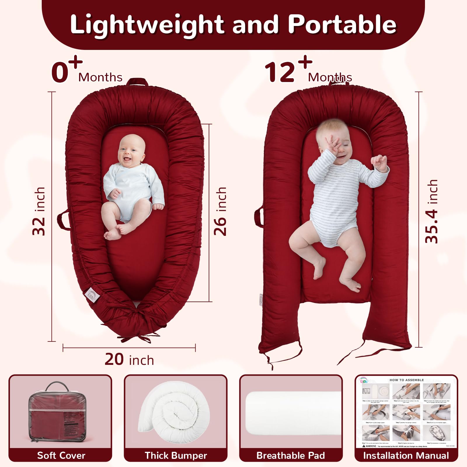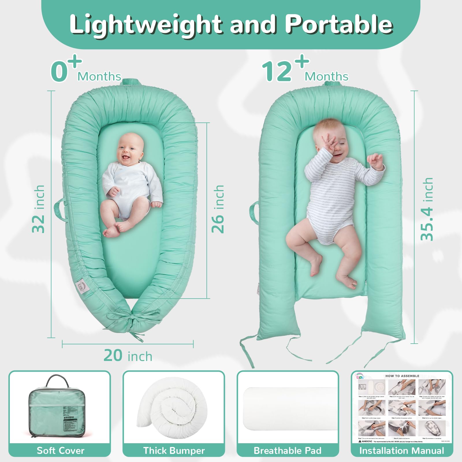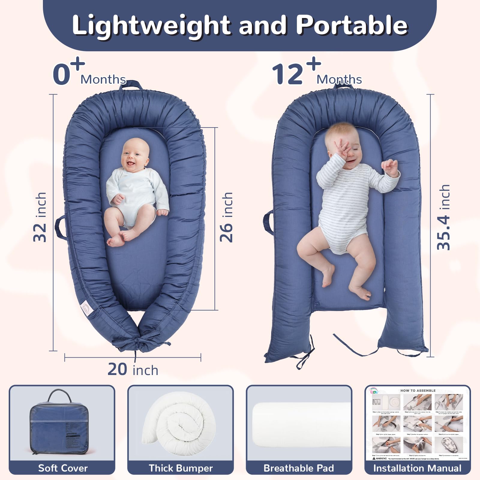 · 👼 SUPREME COMFORT DESIGN: Crafted from super soft and breathable cotton, it features a thick bumper for 360-degree protection and an upgraded thickened mattress. This mimics the womb’s coziness, perfectly supporting the baby’s back and spine development for sweet dreams anywhere, anytime.