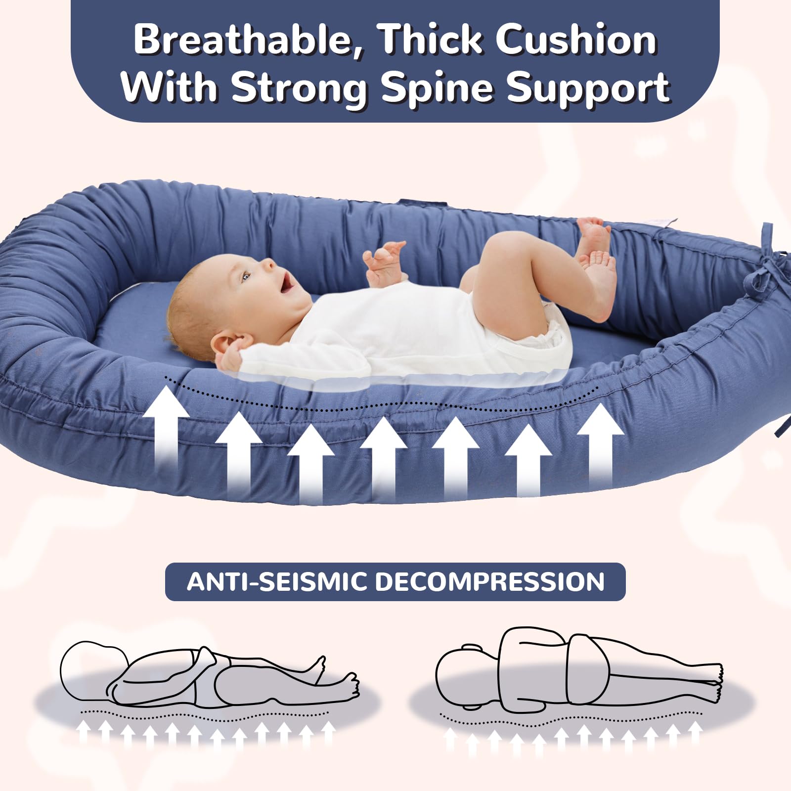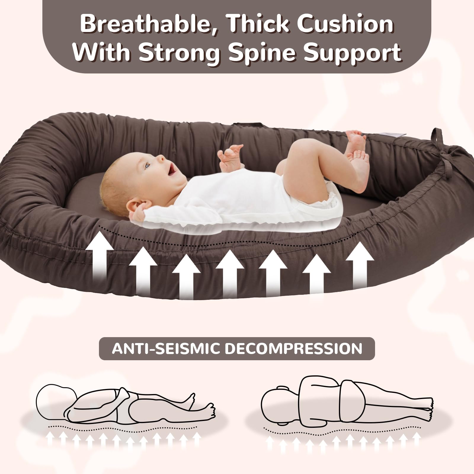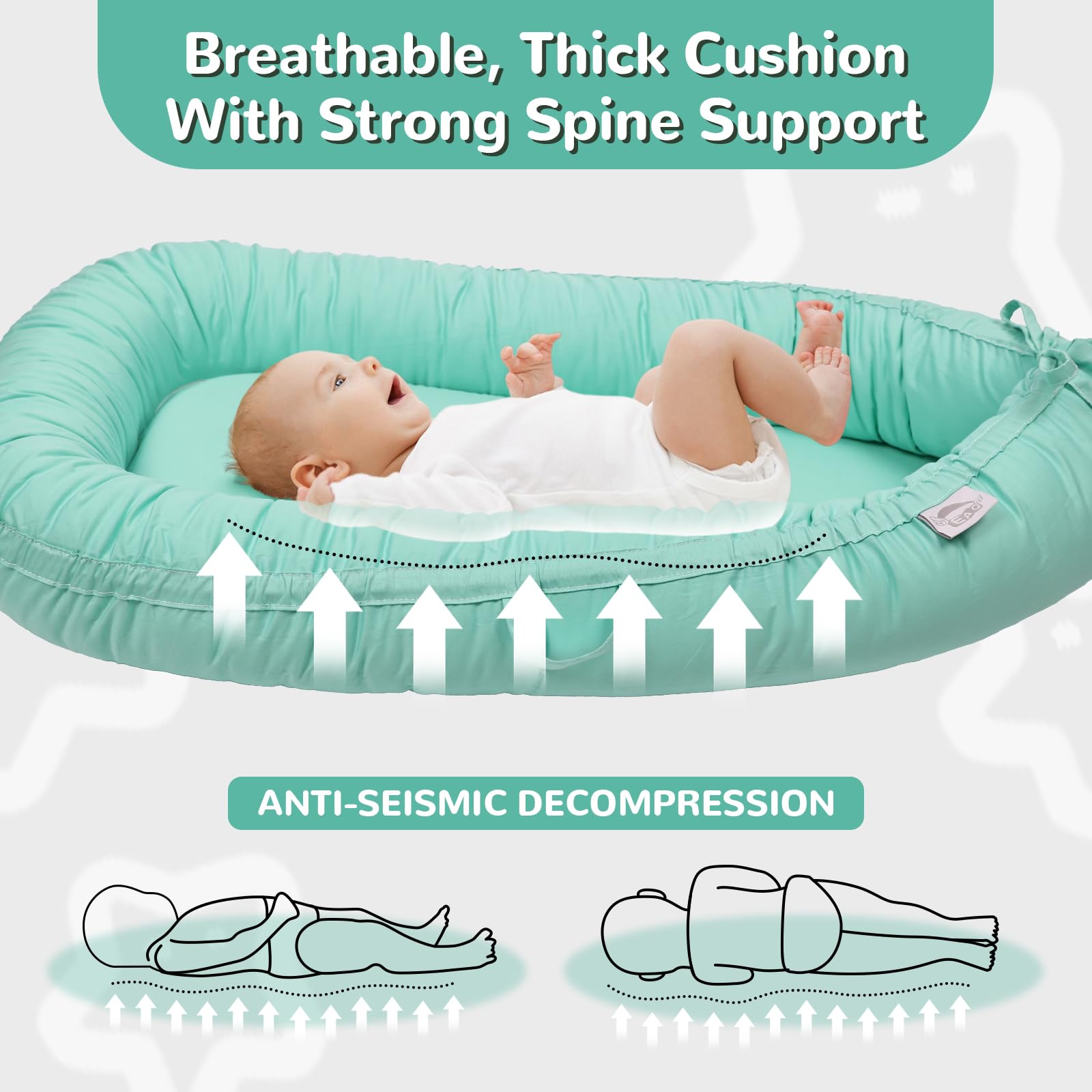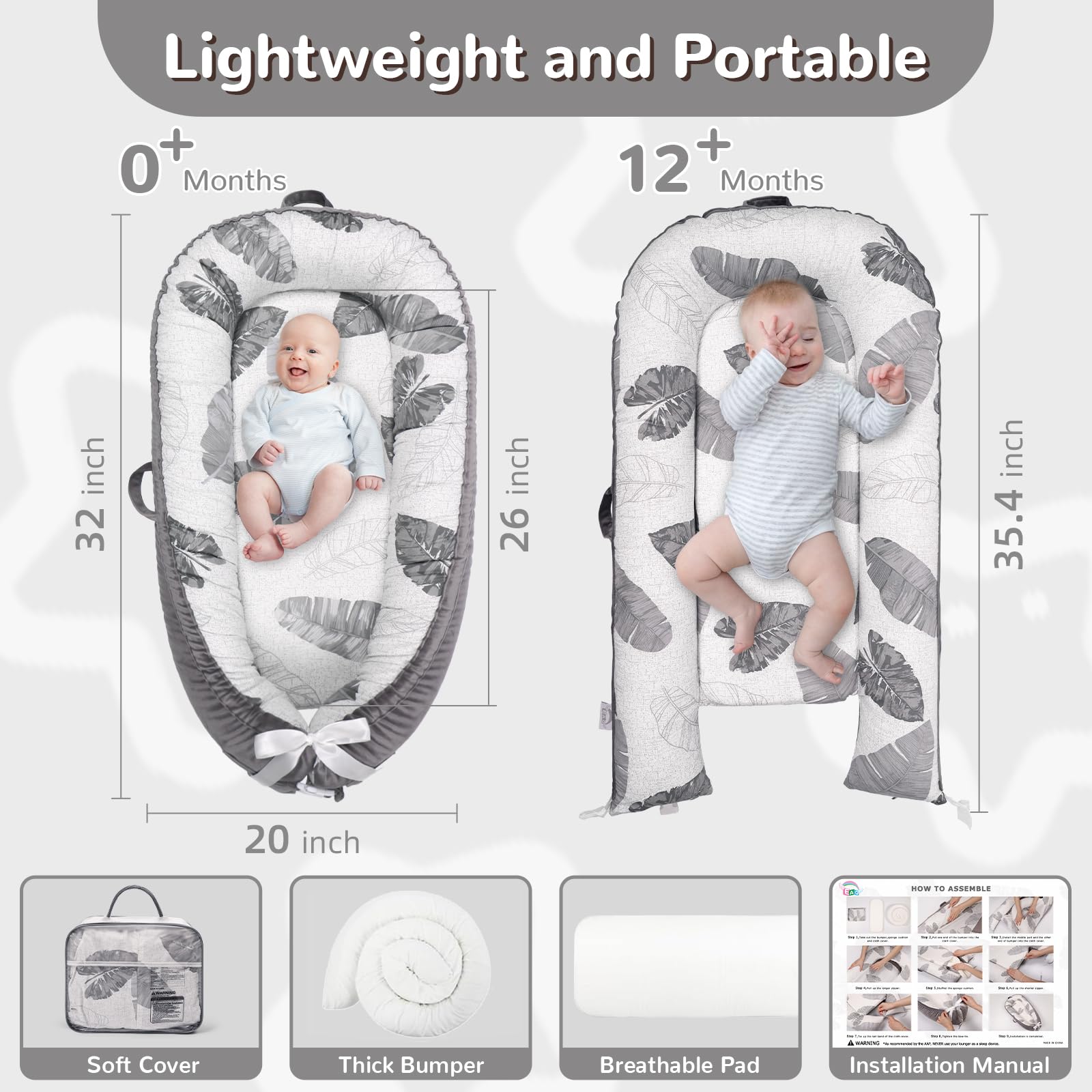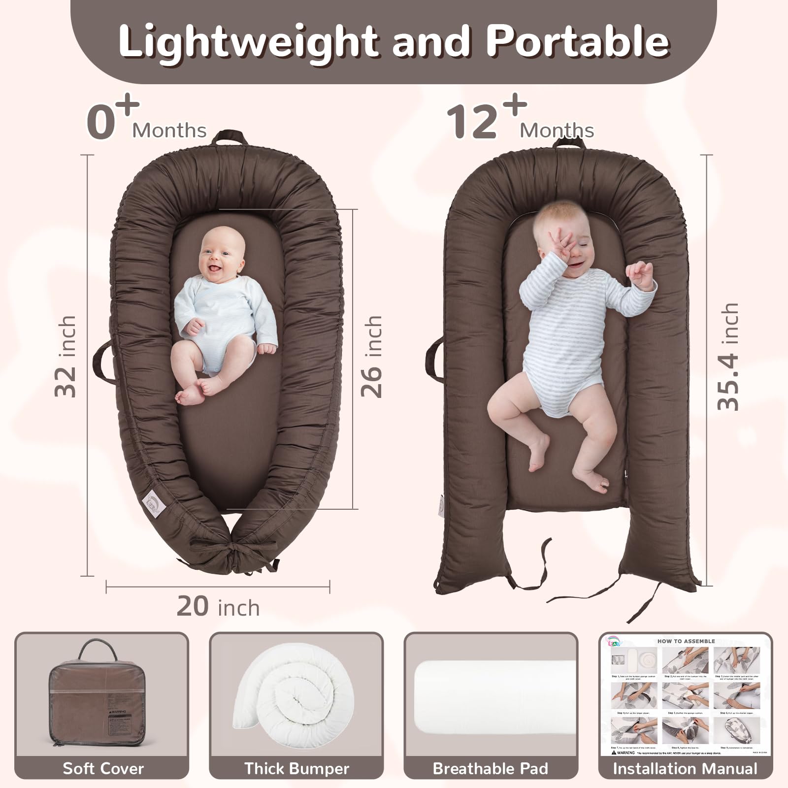 · 👼 SUPREME COMFORT DESIGN: Crafted from super soft and breathable cotton, it features a thick bumper for 360-degree protection and an upgraded thickened mattress. This mimics the womb’s coziness, perfectly supporting the baby’s back and spine development for sweet dreams anywhere, anytime.