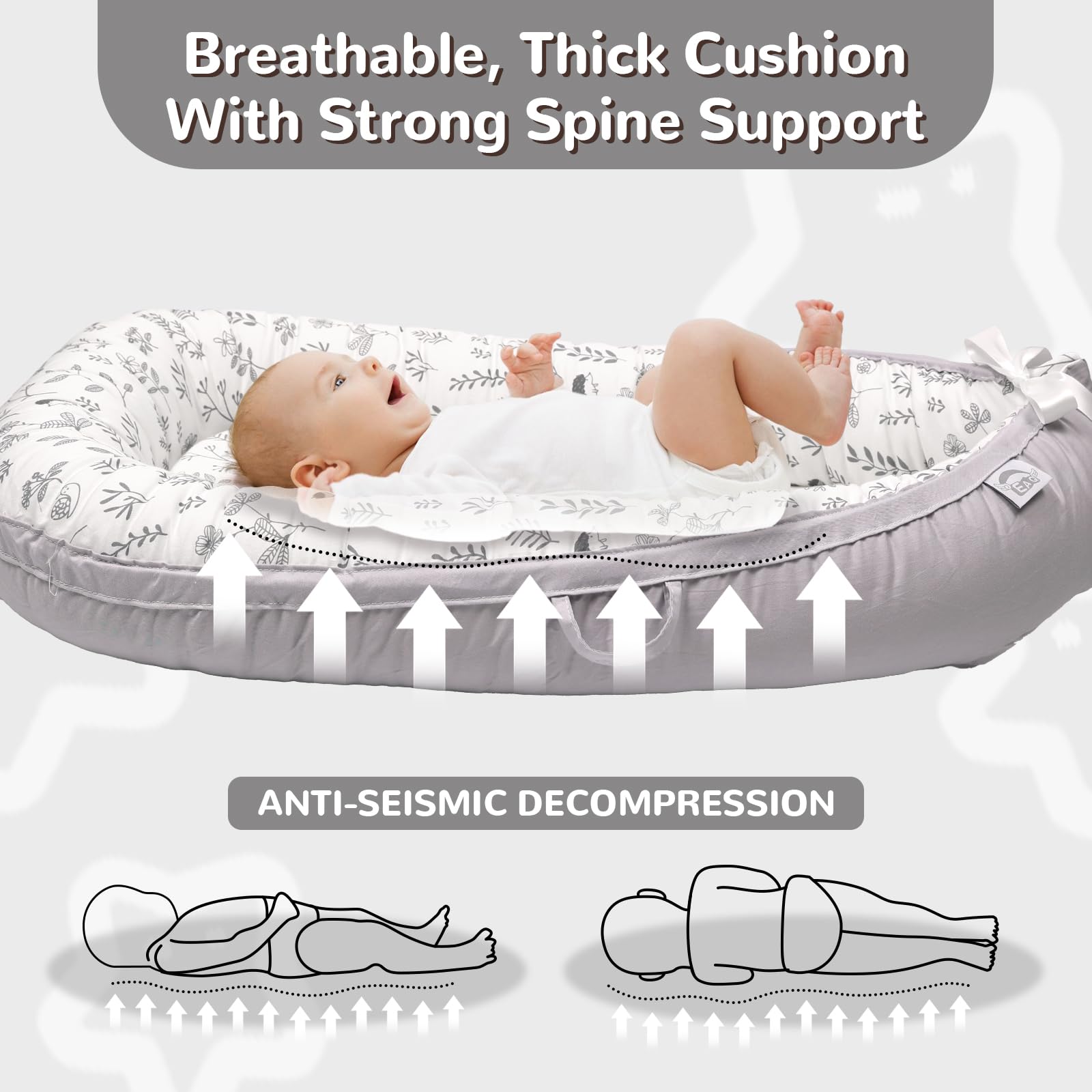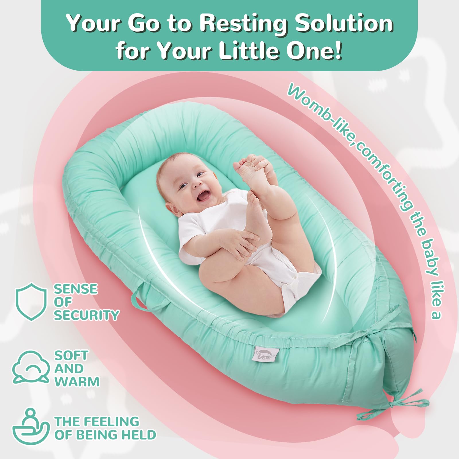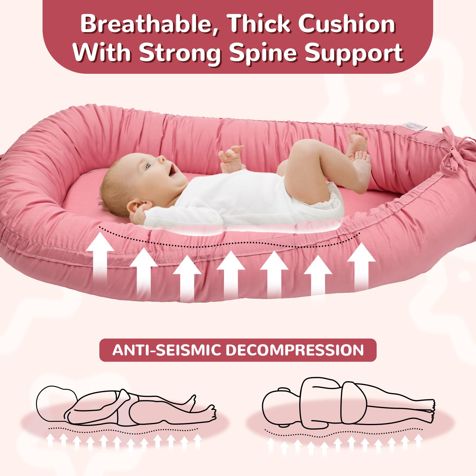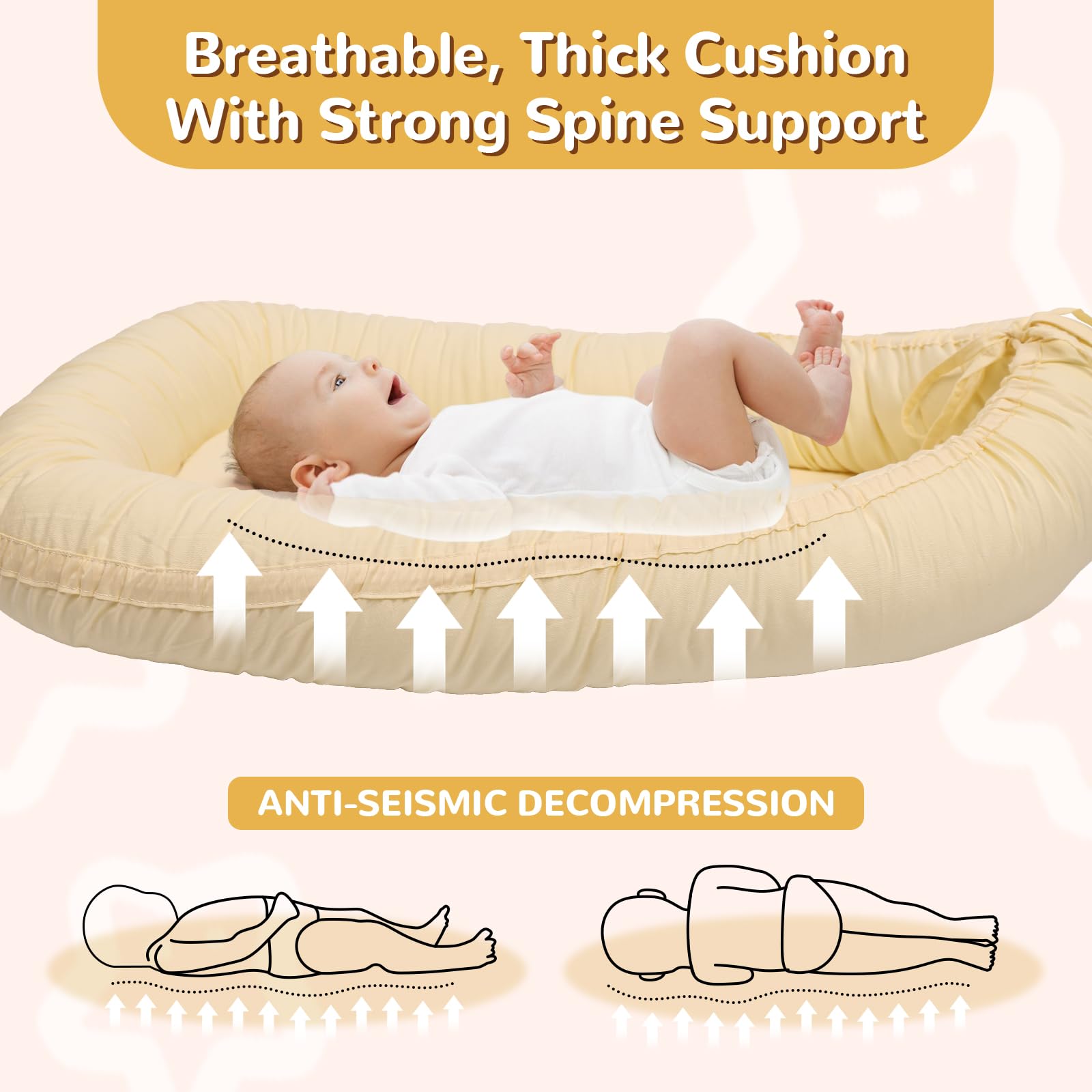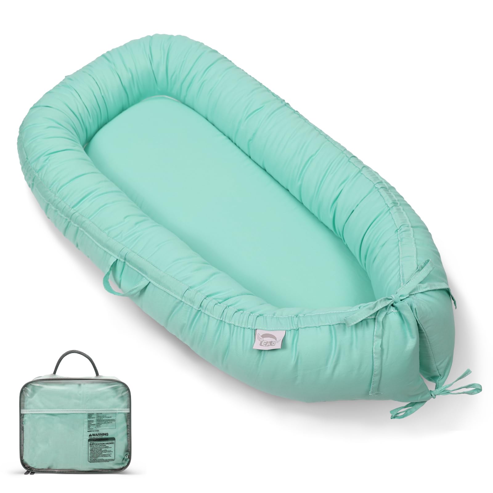 · 👼 SUPREME COMFORT DESIGN: Crafted from super soft and breathable cotton, it features a thick bumper for 360-degree protection and an upgraded thickened mattress. This mimics the womb’s coziness, perfectly supporting the baby’s back and spine development for sweet dreams anywhere, anytime.