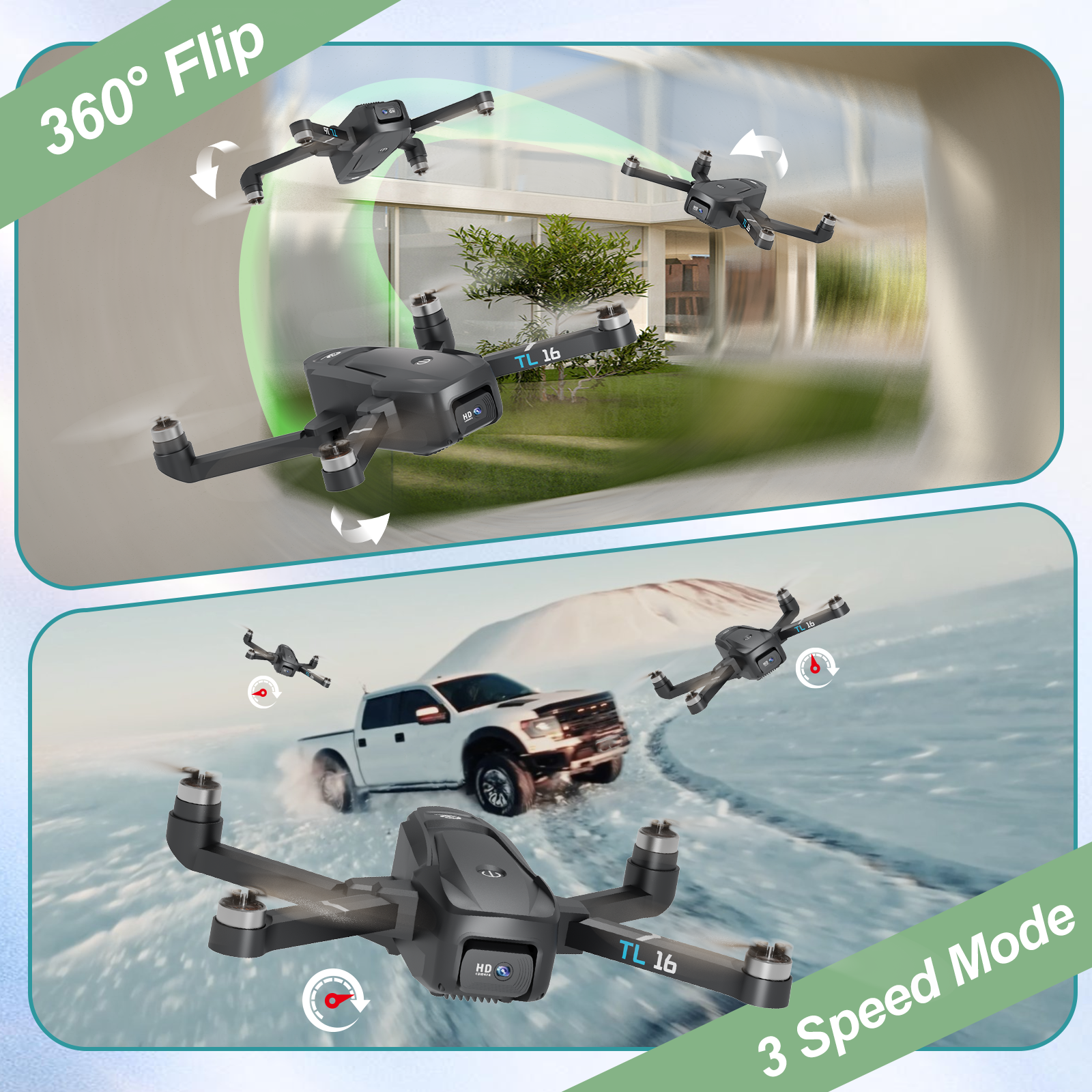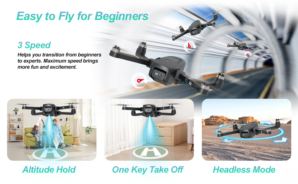 6. Easy to Use Drone: The TL16 features a one-touch takeoff/landing function that allows the drone to take off and hover stably once it reaches a certain altitude. 3 adjustable speed modes help you switch from beginner to expert. When headless mode is activated, there is no need to pay attention to the direction of the drone's head, it will always fly in the direction controlled by the remote controller. Foldable drone design and advanced protective case ensure good protection for the drone.
